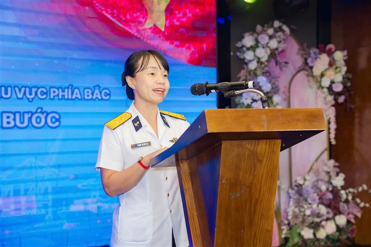 Hình 1: Trung tá Phạm Thị Mỹ Lệ gửi lời Tri ân tới các khách hàng, đối tác Hàng tàu và Đại lý Hãng tàu tại sự kiện Tri ân