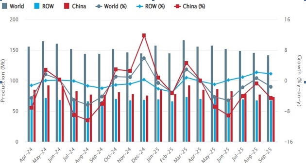 Sản xuất thép thô thế giới trong tháng 9/2025