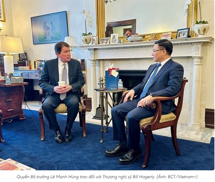 Quyền Bộ trưởng Lê Mạnh Hùng đánh giá cao vai trò của Thượng nghị sỹ Bill Hagerty trong việc kết nối chính giới và cộng đồng doanh nghiệp Hoa Kỳ với các đối tác tại Việt Nam, đồng thời đề nghị Thượng nghị sỹ tiếp tục có tiếng nói ủng hộ tiến trình đàm phán thương mại song phương, góp phần thúc đẩy sớm kết thúc đàm phán Hiệp định Thương mại đối ứng theo hướng công bằng, cân bằng và cùng có lợi.