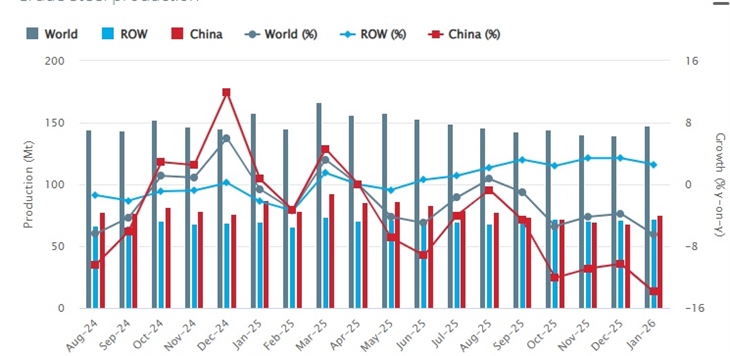 Sản xuất thép thô thế giới trong tháng 1/2026