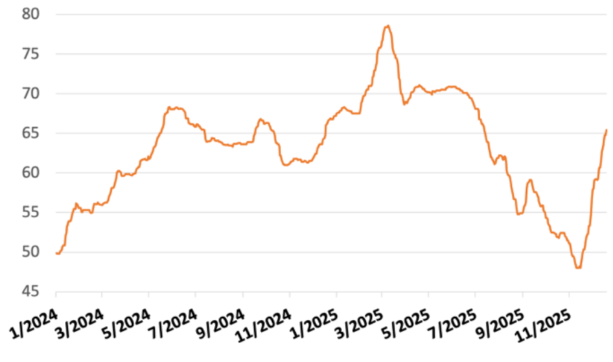 As of the end of November 2025, the national hog herd was estimated to be up 0.3% year on year, while the poultry flock increased by 2.8%.